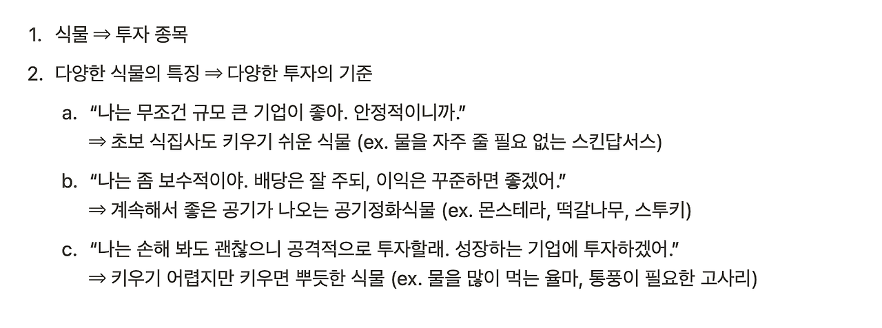캐릭터를 짜든, 콘텐츠를 만들든 결국 한 줄로 요약될 만한 무언가가 있어야 한다는 가치관에 따라 식물을 어필하는 한 줄의 카피를 짰어요. 그게 “나와 맞는 식물을 집에 들이는 것처럼, 가치관에 맞는 종목을 자산으로 들여 기업과 상생하는 건 어떨까?”예요. 목표와 기준이 있으면 시장이 흔들려도 버틸 수 있잖아요. 뿌리와 비슷해 보였어요. 우리는 식물을 들이는 즉시 잎을 기대하지 않지만, 깊게 내린 뿌리를 생각하며 어느 순간 성장하리라는 믿음을 품게 되니까요.